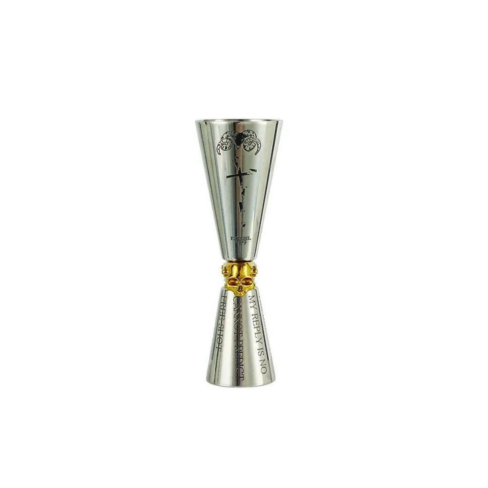 Премиальный барный джиггер с оригинальным принтом из нержавеющей стали толщиной 1,3 мм и вращающейся золотой вставкой в форме черепа. Внутри джиггера имеются полосы деления на 20/25/35/45/55/60 мл. Диметр верх 4,5 см. Диаметр низ 3,8 см.