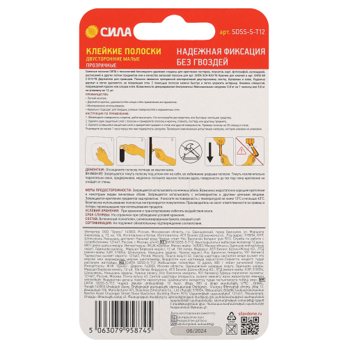 Сменные полоски СИЛА с технологией бесследного удаления созданы для крепления постеров, плакатов, карт, фотографий, календарей, расписаний и других легких предметов или в качестве запасной полоски для арт. СИЛА SCH-K20-T6 Крючки для ключей; арт. СИЛА SHС-D10-T8 Держатели для проводов. Полоски являются прекрасной альтернативой двустороннему скотчу, булавкам и клею. Надежно держат и легко удаляются, не повреждая стен. С помощью полосок можно быстро и легко украсить интерьер. Никаких отверстий, повреждений краски или следов клея. Возможности декорирования безграничны! Максимальная нагрузка: 0,8 кг на 1 полоску или 9.6 кг на упаковку из 12 шт.