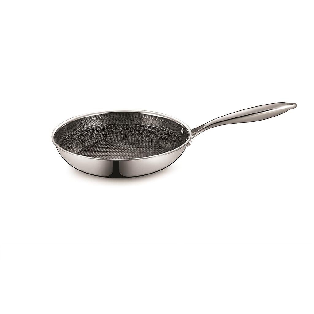 Нерж. сталь "TRI-PLY" с уникальной архитектурой рабочей поверхности нанесенной лазером в виде рельефного сетчатого узора, последующим травлением и нанесением антипригарного покрытия. Такая поверхность создает невидимый слой между едой и поверхностью сковороды, снижает образование масляного дыма и отделяет водяной пар от продукта и прекрасно защищает сковороду от царапин. Важно! Перед первым использованием сковороду нужно вымыть с моющим средством, затем налить 2/3 воды от объема и довести до кипения на среднем огне, подождать 5 минут, выключить нагрев и оставить остывать естественным образом еще на 5 минут. Затем смажьте внутреннюю поверхность сковороды растительным маслом (или любым жиром) и нагревайте ее на среднем огне, 1-2 минуты. После дайте остыть и очистите ее водой. При дальнейшем использовании, необходимо свести к минимуму сильное нагревание, так как сковорода обладает очень сильной теплопроводностью. Это снизит прилипание продуктов к сковороде и предотвратит подгорание.
