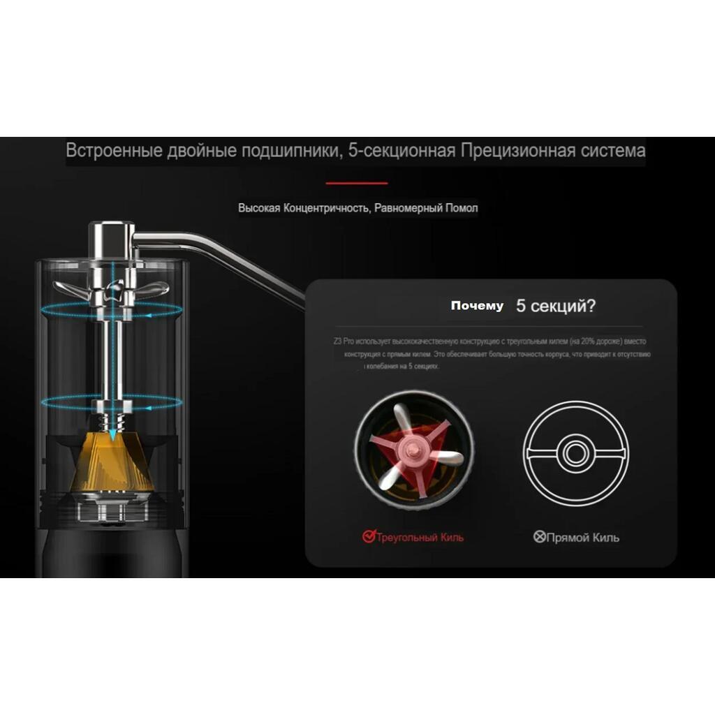 Эксклюзивные жернова HG6-38 с титановым покрытием. [ТИХАЯ] Эта кофемолка практически не издает шума благодаря прочному стальному валу и отсутствию пластиковых деталей, которые могут вибрировать. [ПРОЧНАЯ] Ручная кофемолка Z3 с жерновами выглядит так, будто прослужит вам всю жизнь. Детали точно подогнаны друг к другу, в них нет ничего лишнего, как в других изделиях, а прочный алюминиевый корпус и деревянная ручка гарантируют долгий срок службы. [ПРОСТОТА ИСПОЛЬЗОВАНИЯ] Размер помола при ручном измельчении кофе одинаков. Настройки не требуют пояснений. Пронумерованный диск (1–12) позволяет легко запомнить ваши предпочтения для разных целей и надежно настроить помол. [ПРОСТОЕ ИСПОЛЬЗОВАНИЕ] Для работы с рукояткой кофемолки z3 требуется совсем немного усилий, и она полностью очищается независимо от того, какой размер помола мы используем. Текстурированные боковые поверхности облегчают захват во время помола, а деревянная ручка свободно вращается. Мы не сталкивались с проскальзыванием, застреванием или пропуском. [ПРОСТОТА ХРАНЕНИЯ] Без рукоятки эта кофемолка z3 занимает очень мало места в ящике, шкафу или на столешнице (или в чемодане!). Камера для зерен на 25гр, Камера для измельчения на 30гр.